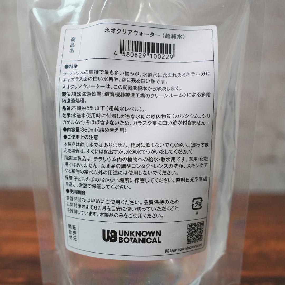 効果:水道水使用時に付着しがちな水垢の原因物質(カルシウム、マグネシウムなど)をほぼ含まないため、ガラスや葉に白い跡が付きません。